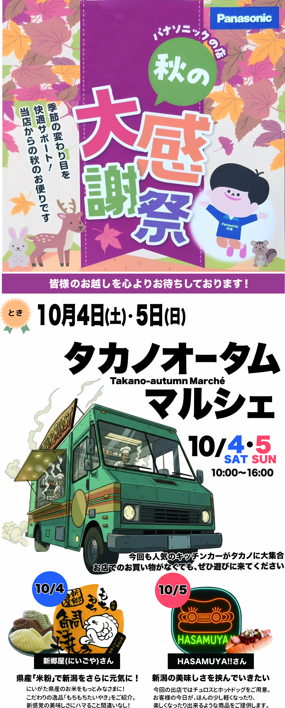 人気のキッチンカーがタカノのお店に集まります。来る10月4日(土)と5日(日)は、秋の大感謝祭へ